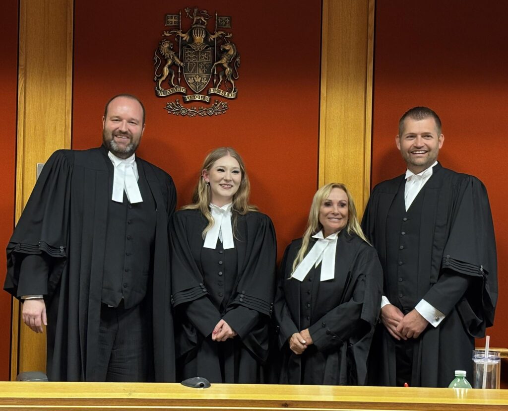 Darcy, Claudia, and Vincent are thrilled to offically welcome Brittany as the newest lawyer at Connolly Shurtz Law. This special moment captures Brittany being granted by Justice Auger — a huge milestone and the beginning of an exciting new chapter in her legal career.